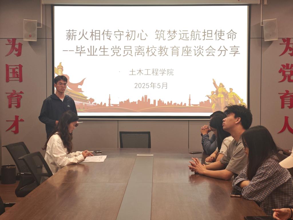 5月19日下午,在理工楼112会议室开展毕业生党员离校系列活动之一席师生座谈。学工负责人徐超老师在座谈中回忆了2025届毕业生党员的峥嵘岁月,肯定了他们的成绩与付出,并祝福广大党员毕业生顺利毕业,前程似锦。学院组织员朱徐迪老师针对毕业生党员普遍关注的党组织关系转接问题进行了细致讲解,明确转接流程、时间节点与注意事项,确保每一位毕业生党员都能清晰了解操作步骤,顺利完成党组织关系转接,保障党员组织生活的连续性。同时,承诺一定会为毕业生党员顺利毕业做好服务,确保顺利毕业。毕业生党员代表王子阳、展景涛回顾了在校期间拼搏奋斗、努力成才的青春故事,畅谈了四年求学历程中的所思所感。党员代表们感恩学校党组织的培养以及母校、师生给予自身的帮助与关怀。他们表示,在新的人生旅途中将时刻牢记共产党员的初心使命,积极发挥党员的先锋模范作用,踔厉奋发,以优异的成绩回报母校。