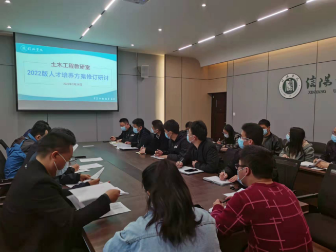 3月30日下午,土木工程教研室在理工楼112会议室召开2022版人才培养方案修订专题研讨会。信阳学院教学督导吴锐教授,土木工程学院名誉院长,教学副院长杨子泉,督导王国际教授,邱荣茂教授、余沛副教授及土木工程教研室全体教师参加了会议,会议由教研室主任付善春主持。