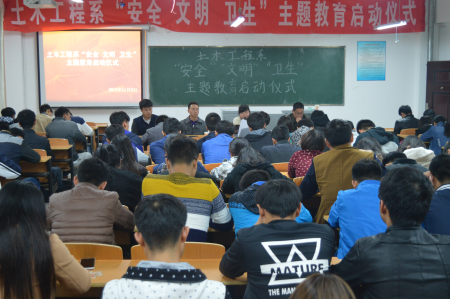 11月5日中午,土木工程系在理工楼302教室举行“安全、文明、卫生”主题教育启动仪式,学工秘书郗利选,团总支书记潘兵远,辅导员付善春、肖磊,学生会干部及各班班委共120余名学生参加了仪式。