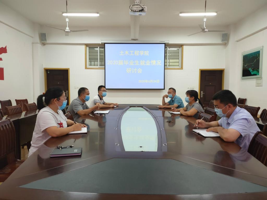积极响应学校关于就业工作的会议精神,2020年6月24日,土木工程学院党总支书记、副院长潘卫国,行政秘书郗利选,教学干事王亮,学工干事徐超,辅导员吴琼茹,唐辉,蔡大海在理工楼201会议室召开了土木工程学院2020届毕业生就业情况分析研讨会。