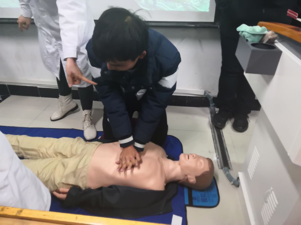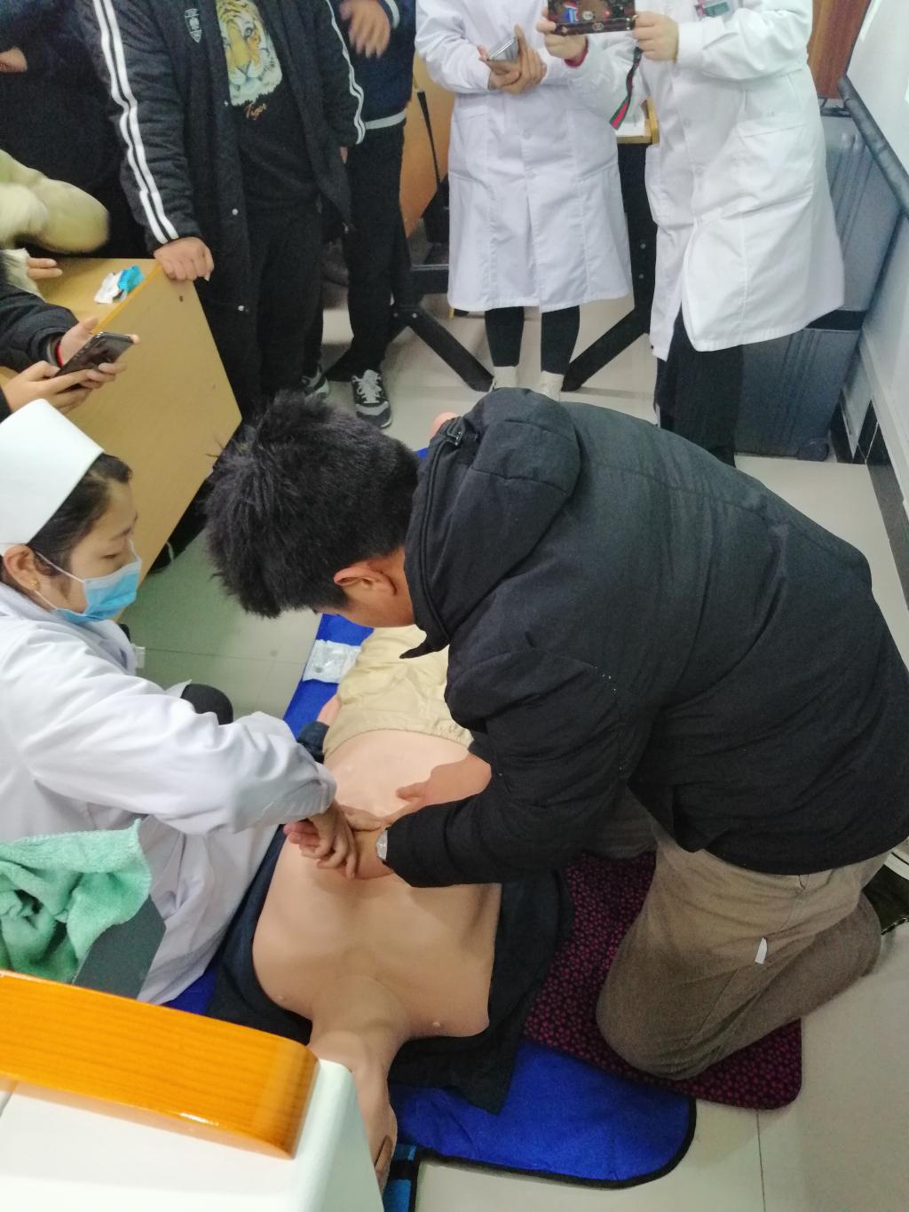 易医生首先用通俗易懂的语言讲述了心肺复苏基本理论知识,让同学们了解了心源性猝死、黄金四分钟、第一响应人等医学专有名词;其次,让同学们熟悉了心肺复苏术的三个核心步骤:胸外心脏按压、打通气管、人工呼吸,基本掌握了当事人有无意识的初步判断、胸外心脏按压、打开气道、人工呼吸等操作方法并进行了急救示范。最后,同学们踊跃到模型前面进行现场情况的实战模拟,校医院医生在一旁耐心的为同学们纠正着错误,直到同学们对这项救助技能真正掌握为止。