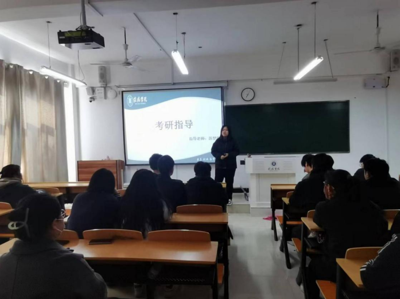 会上,苏梦田老师从近五年国家复试分数线的分析、考研院校的选择及招生简章的解读、复习方法的指导、考研时间的分配等四个方面为同学们做了详细的讲授。鼓励同学们保持积极的心态,相信自己的能力,不要犹豫徘徊,学会自学,不怕挫折和困难、超越自我。交流环节,针对同学们的疑惑,苏老师一一做了详细的解答。会后同学们纷纷表示参加此次活动,受益匪浅,立志考研。