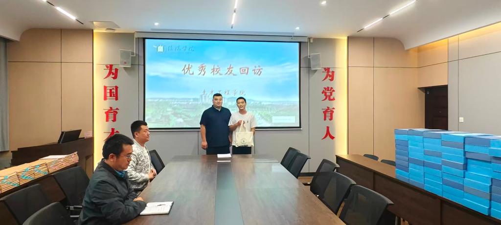 学院党总支书记徐远东、学工干事徐超及辅导员徐飞热情接待了这位特殊的“返校学子”。徐远东亲切询问了赵鸿飞在部队的服役情况及就业规划,对他积极响应国家号召、投身国防事业并载誉归来的行动给予了高度赞扬。