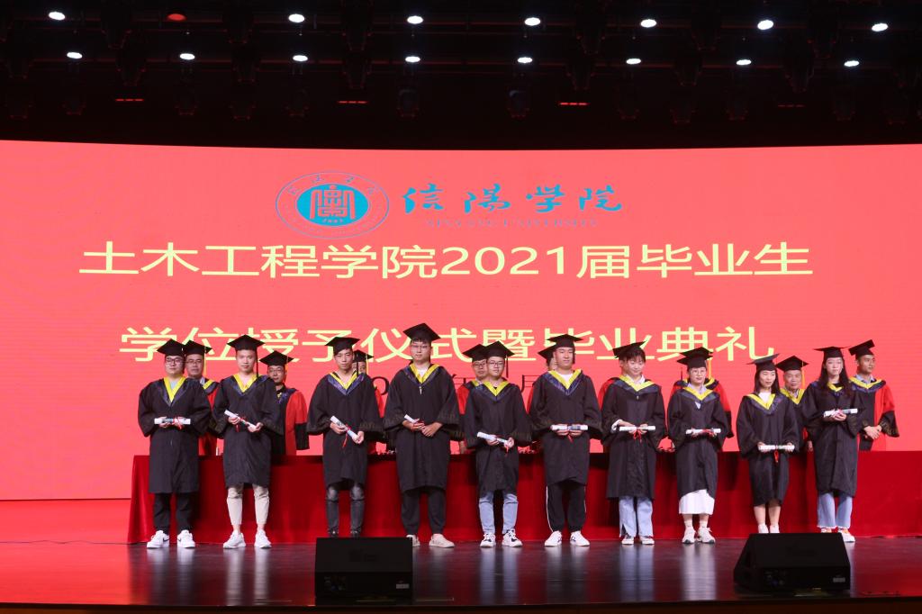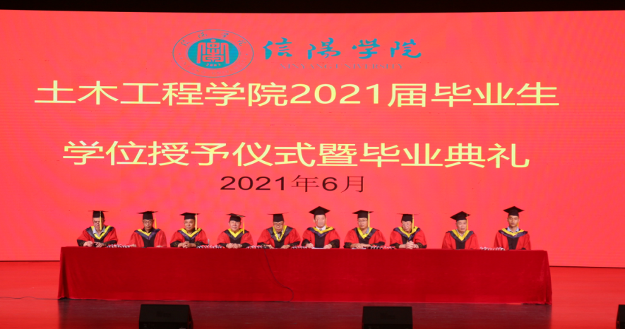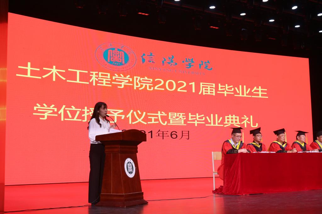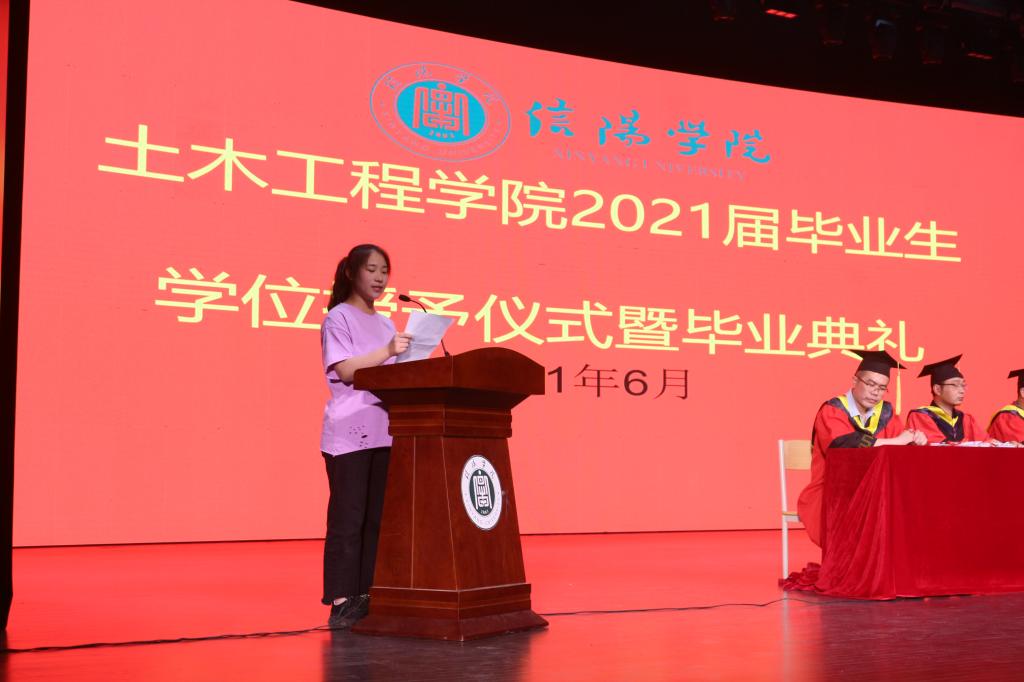典礼在庄严的国歌声中拉开了帷幕。毕业典礼上,教学副院长杨子泉宣读了《信阳学院关于2021届毕业生学士学位授予的决定》。