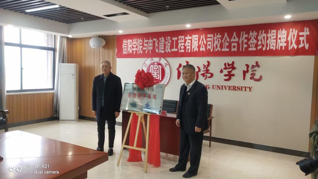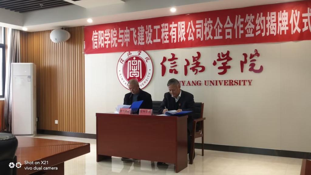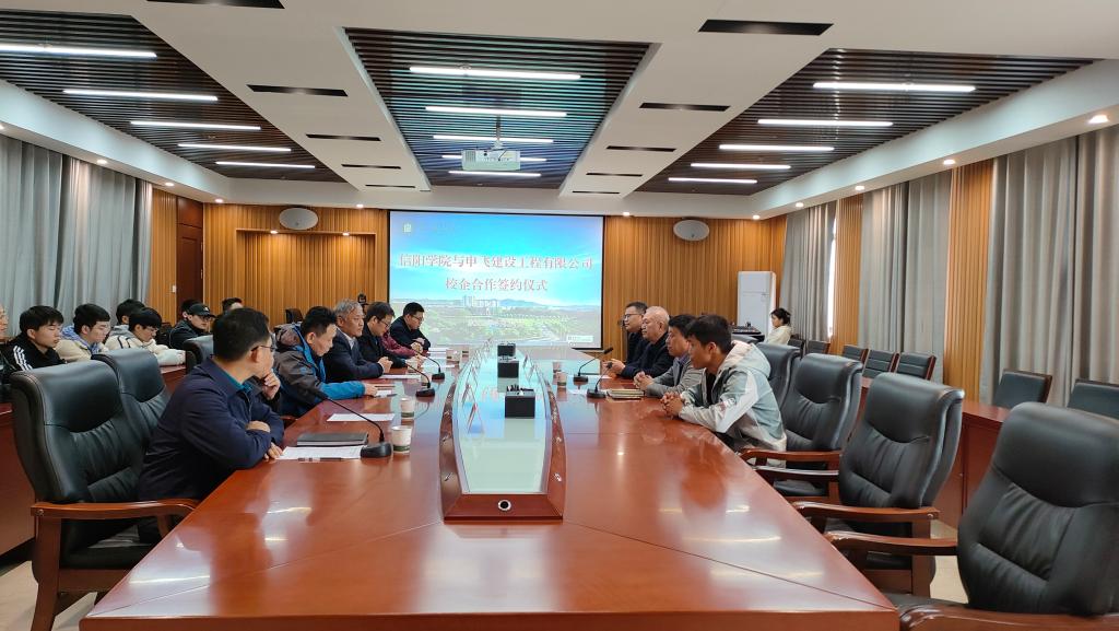 3月24日,信阳学院与申飞建设工程有限公司校企合作签约揭牌仪式在综合楼1410会议室举行。申飞建设工程有限公司总经理王洪中、副总经理梅学强、郑振斌,我校副校长王强、校长助理杨高伟出席仪式。教务处长陈文涛、土木工程学院名誉院长、党总支书记郭二军、教学副院长杨子泉、特聘教授王国际及部分师生代表参加了仪式。杨子泉主持了签约仪式。