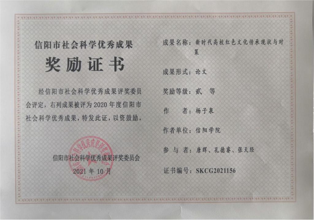 杨子泉较早地将课程思政育人融入专业课程,他从工程安全、工匠精神、社会主义核心价值观、信阳红色文化、信阳茶文化等角度出发开展课程思政,实现了知识传授与价值塑造的统一。杨子泉发表的课程思政论文《新时代高校红色文化传承现状与对策》荣获2020年度信阳市社会科学优秀成果二等奖。