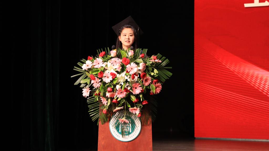 毕业生代表、国家励志奖学金获得者、河南省“三好学生”、校第十四届“校园明星”、考取广州大学研究生任晶媛同学发言,她向老师们表达了由衷的感谢和敬意,分享了四年来的成长历程与收获,并表示会继续坚定自己的信念,脚踏实地、追逐美好未来。