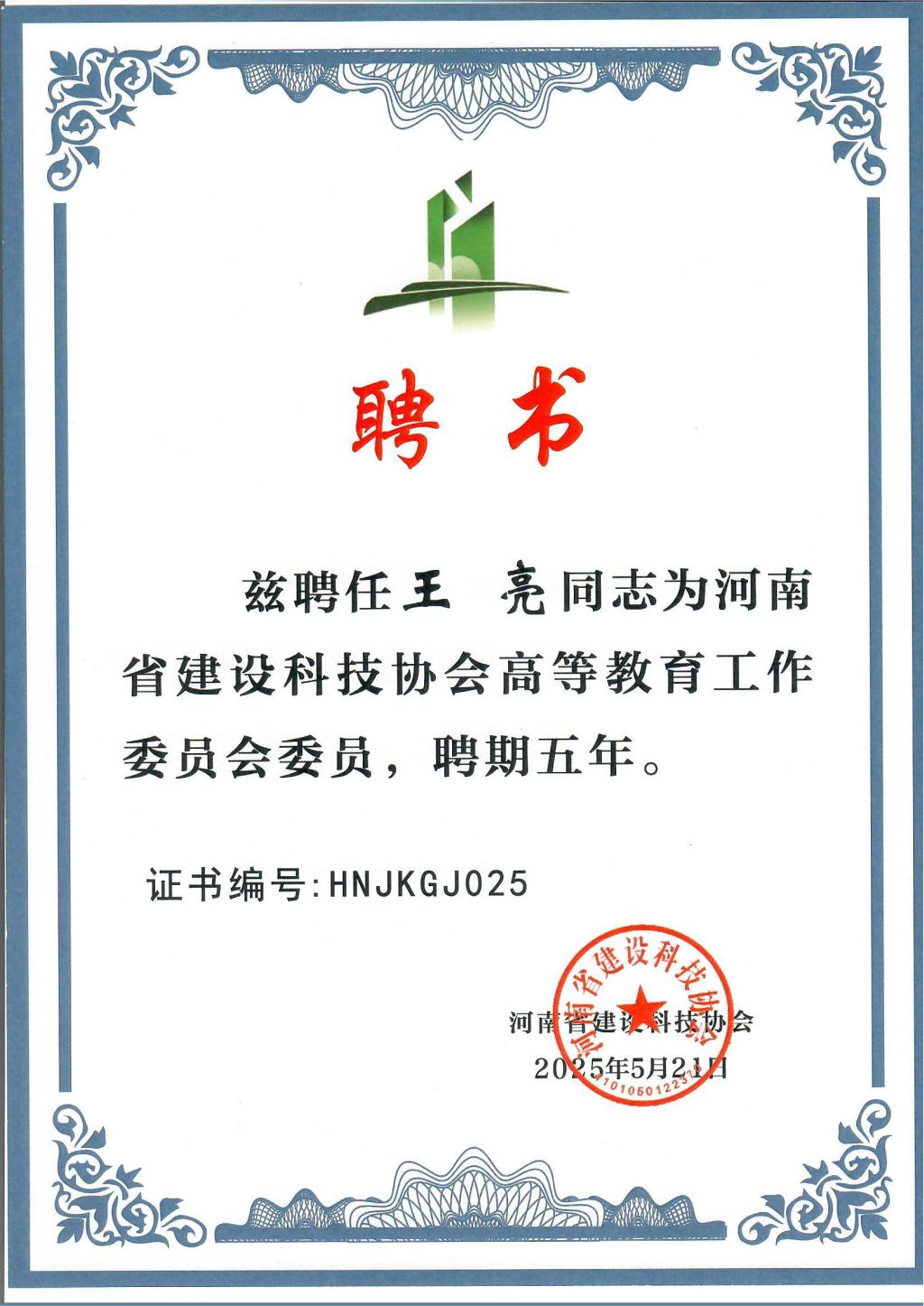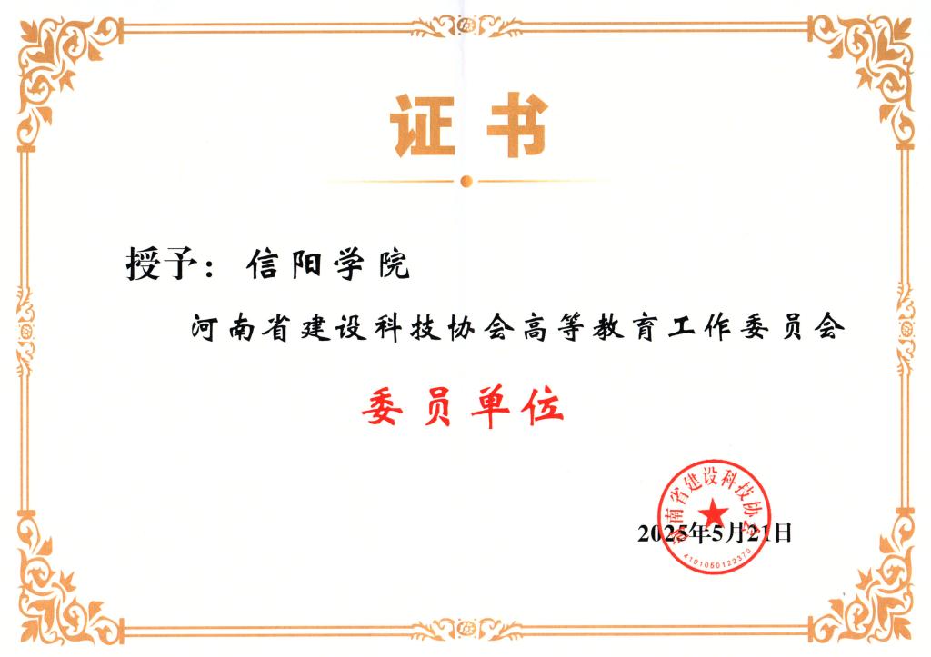 5月21日,信阳学院被河南省建设科技协会授予“河南省建设科技协会高等教育工作委员会会员单位”。我校土木工程学院教学副院长杨子泉、教学干事王亮被聘为河南省建设科技协会高等教育工作委员会委员,聘期五年。
