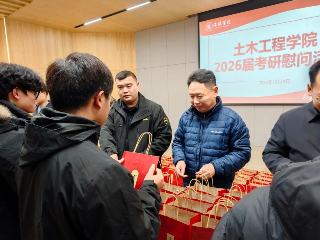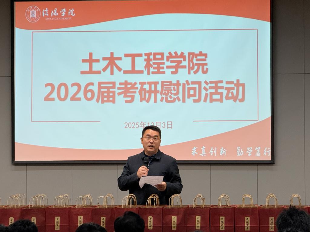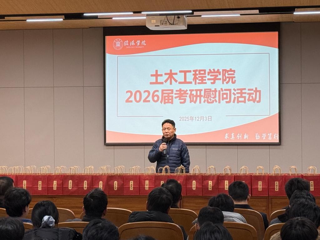 考研临近,为了给2026届考研备战学子加油鼓劲,缓解备考的紧张焦虑情绪,树立必胜的信心,12月3日下午,土木工程学院在浉河校区图书馆101报告厅举行了2026届考研学子慰问活动,学院名誉院长鲍鹏、党总支书记徐远东、教学副院长杨子泉、各秘书干事、毕业班辅导员及200余名2026届考研学子参加了本次活动。活动由党总支书记徐远东主持。