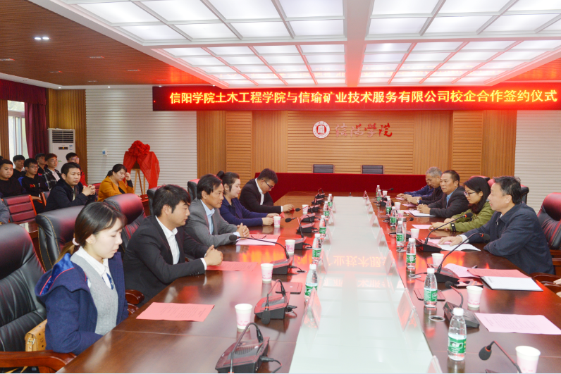 10月31日下午,我校土木工程学院与信瑜矿业技术服务有限公司校企合作签约揭牌仪式在人文楼208会议室举行。信阳市测绘地理信息局领导江元志、信瑜矿业技术服务有限公司总经理孙婷婷、业务部经理周浩、矿产项目负责人尹家林、办公室主任王子媚、信阳学院副校长王志华、教务处副处长邓荣娟、土木工程学院党总支书记兼副院长潘卫国、学院特聘专家教授雷绍民、王钢城、连星耀、徐伯荣及部分师生代表参加了签约仪式。仪式由土木工程学院院长主持。